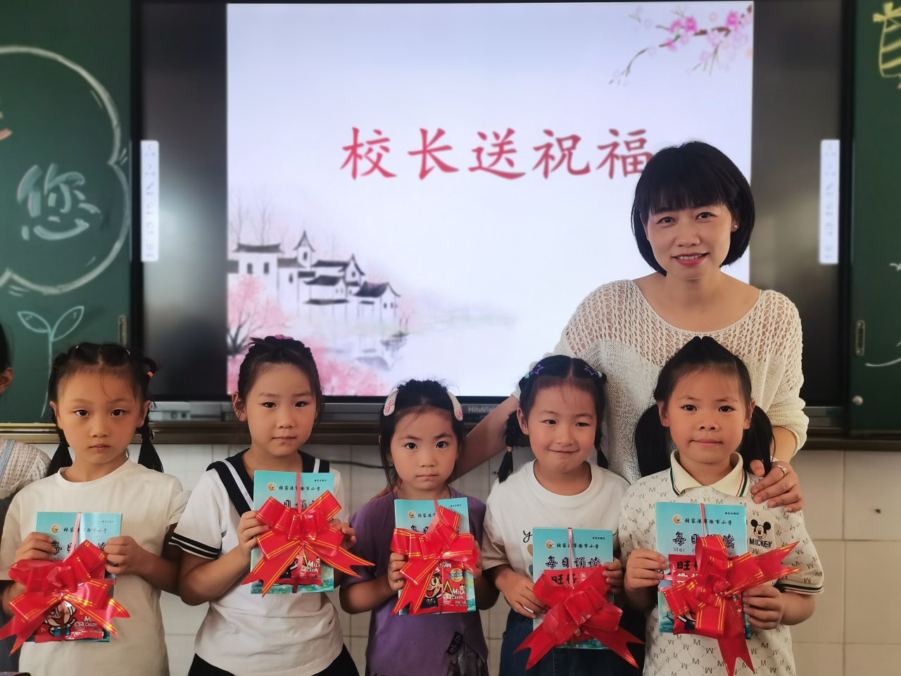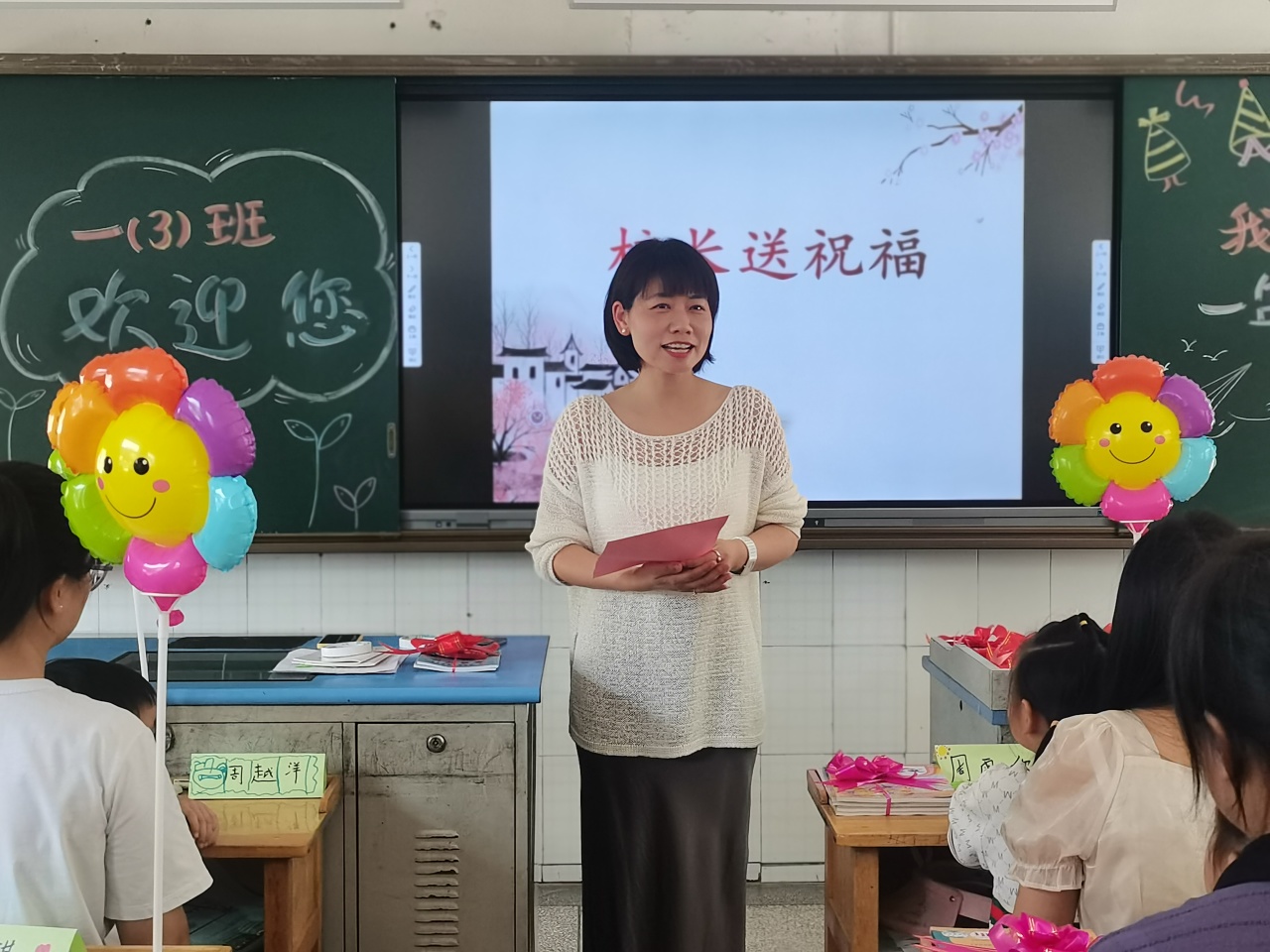 四位校长分别走进一年级四个班,给孩子们送上祝福,祝福大家从此踏上人生新的征途。同时给孩子们送上了甜蜜开学礼。