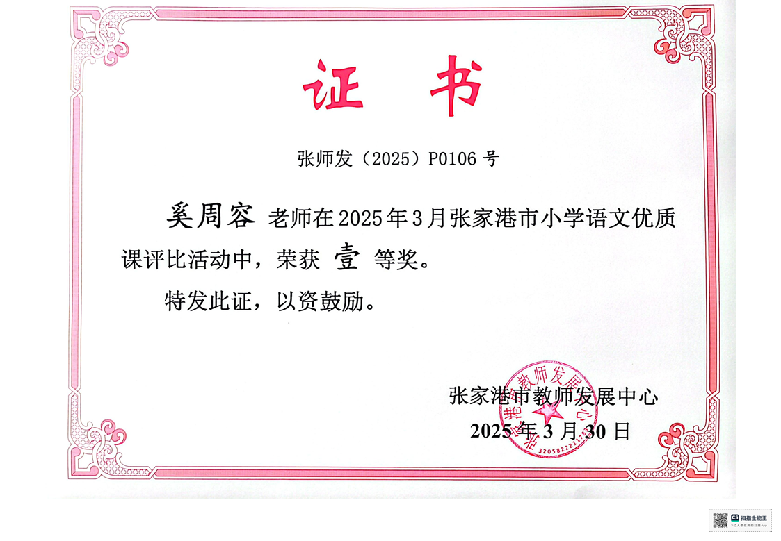 喜报:我校奚周容老师获张家港市语文评优课一等奖 来源: 发布时间:2025-04-15 08:45:54 浏览次数: 次 【字体:小 大】 奚周容《黄帝的传说》一等奖县级2025.3张家港市教师发展中心 终审:冯文刚 分享到: 【打印正文】